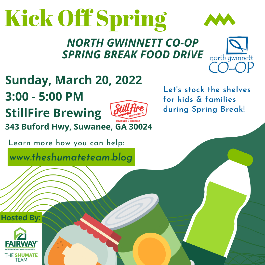Join us on the First Day of Spring at StillFire Brewing! We’ll kick off the season on the patio and collect much needed items for the North Gwinnett Co-op to help stock the shelves for kids and families during Spring Break.