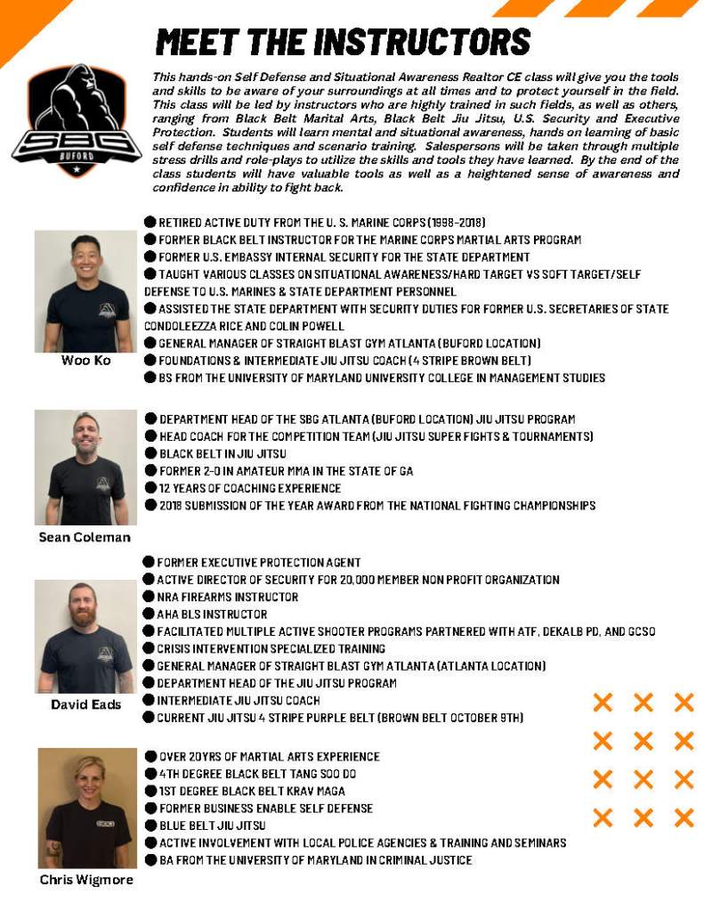 This hands-on Self Defense and Situational Awareness Realtor CE class will give you the tools and skills to be aware of your surroundings at all times and to protect yourself in the field. This class will be led by instructors who are highly trained in such fields, as well as others, ranging from Black Belt Marital Arts, Black Belt Jiu Jitsu, U.S. Security and Executive Protection. Students will learn mental and situational awareness, hands on learning of basic self defense techniques and scenario training. Salespersons will be taken through multiple stress drills and role-plays to utilize the skills and tools they have learned. By the end of the class students will have valuable tools as well as a heightened sense of awareness and confidence in ability to fight back.