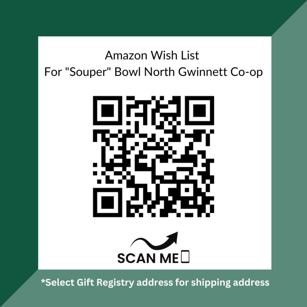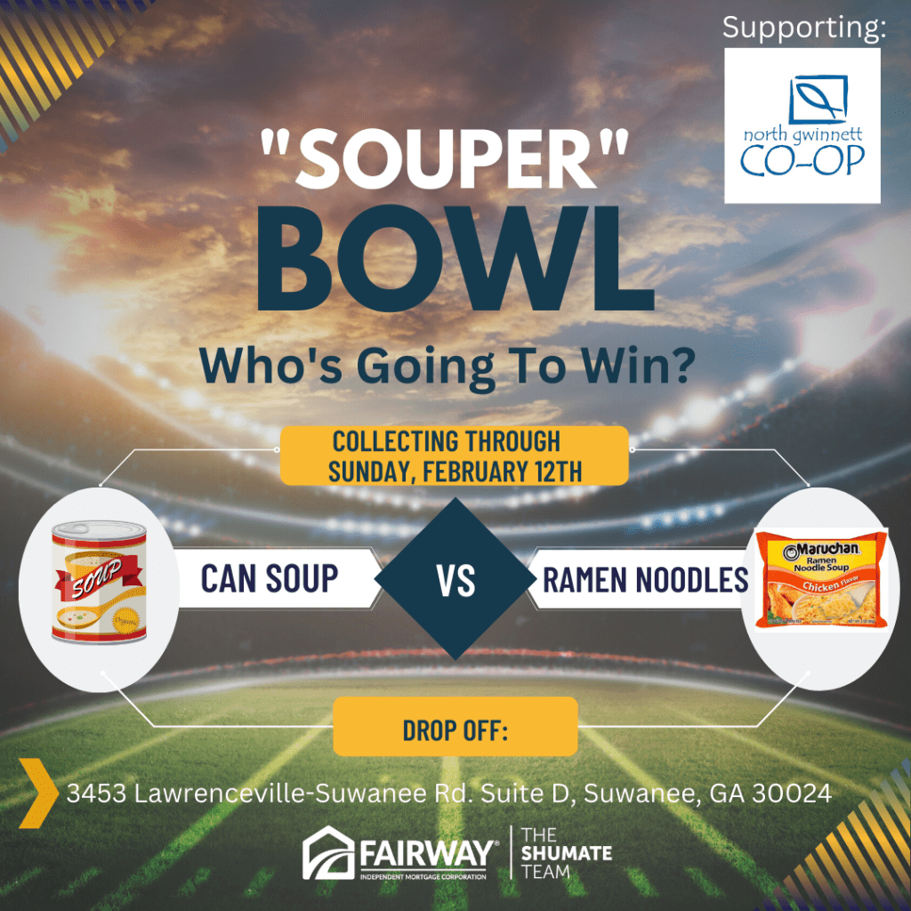 The North Gwinnett Co-Op has immediate needs to restock the shelves after the holidays. We are collecting through Super Bowl Sunday Feb 12th. Specific needs: Vegetable Soup, Cream of Chicken Soup, Canned Pasta (Spaghetti O’s, Ravioli, etc), Ramen Noodles.